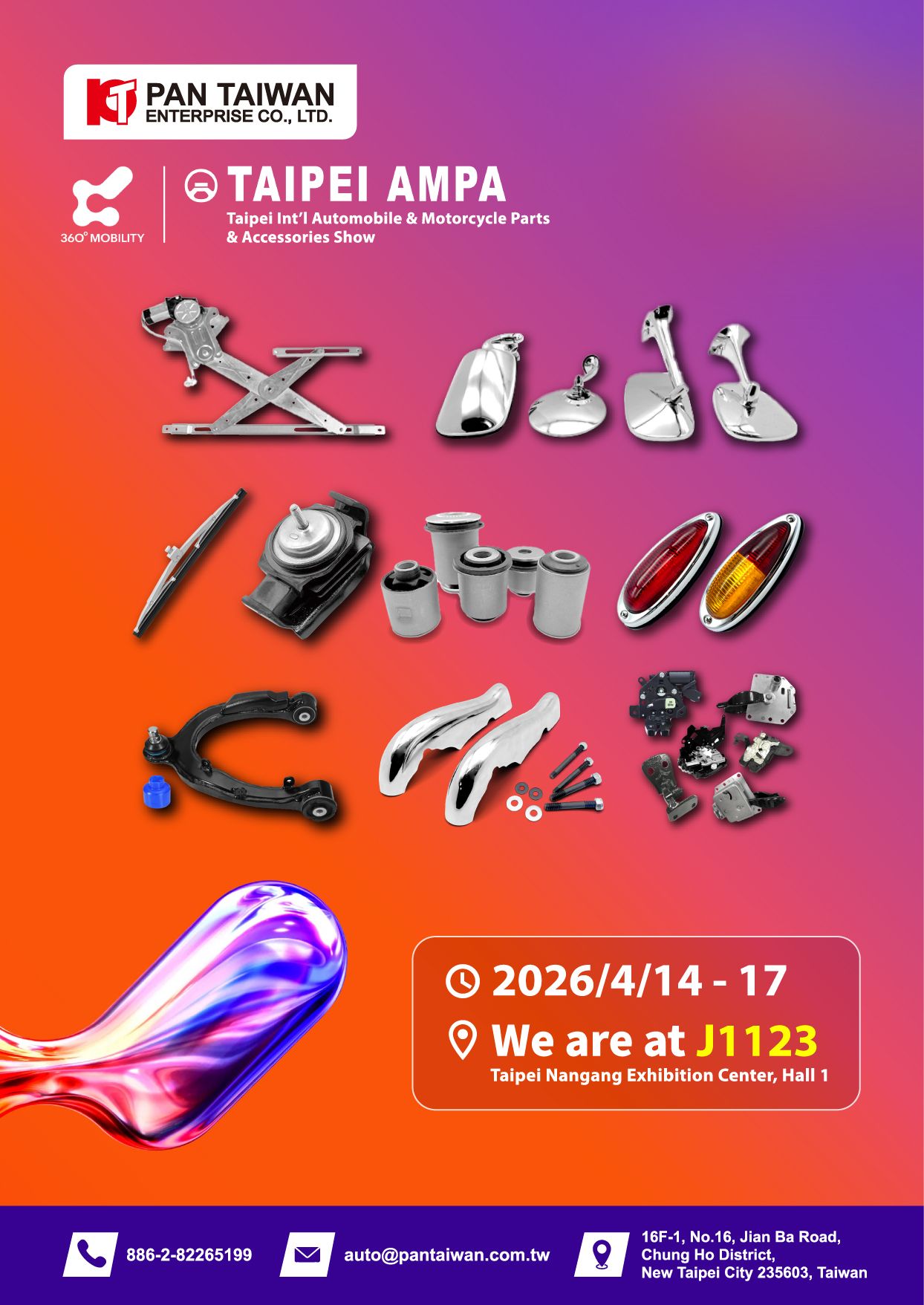 Pan Taiwan awaits all the visitors at AMPA 2026 at booth number J1123 from 4/14-4/17. In addition to our products including window regulator, classic car parts, engine mount and bushing, and customized parts, Pan Taiwan also provide the consolidation service for various auto parts. Please join us at our booth at AMPA 2026 if you have any needs for these products.